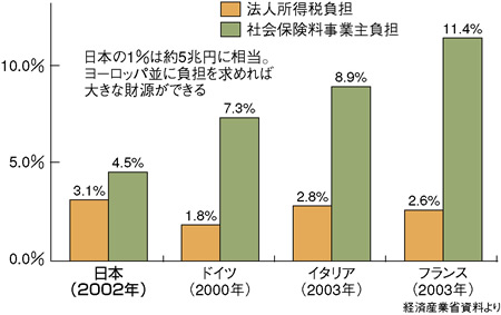 財界も〇三年に経団連が「活力と魅力溢れる日本をめざして」を発表。社会保険料負担は「本来、個人が全額負担するところを事業主が肩代わりしているもの」で、全額個人が負担すべきだと主張。