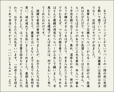 | 埼玉・ケアステーションみさと(東京民医連)では、介護実践を利用者さんへの手紙で記録。この一文はそのひとつ。老いてもその人の尊厳を守ろうという心が伝わる。介護職は生存権を守る最前線の仕事だ |