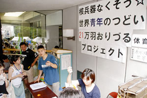 「青年たちの二一万羽プロジェクト」は、一瞬にして命を奪われた二一万人への思いを込めて、二一万羽の折り鶴をと企画されました。よびかけ人の小林秀一さん(元ボクシング日本ウエルター級チャンピオン)は、運動は大きく広がり、すでに五〇万羽に上っていると報告。