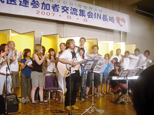 医師、医学生も約四〇人参加。福井医大一年生の前田亜里紗さん、鹿児島生協病院・一年目研修医の中島悟さんが決意を語り、全日本民医連医師研修委員長の 山本一視医師や長崎民医連反核平和委員長の菅政和医師が激励しました。会場は大きな感動でつつまれ、最後は、奏者「心人」とともに、「原爆許すまじ」など を腹の底から歌い、心をひとつにしました。