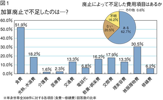 「食費」「被服履物費」「光熱・水道費」などの費用が、老齢加算の廃止で不足した世帯が六割を超えました。さらに不足した項目は一つにとどまらず、二~三項目で「足りない」という回答が最多でした(図1)。「脳梗塞後遺症があり、冷暖房を節約できない。食費を抑え朝は水でお腹を膨らます」「おかずが欲しくなるのでご飯は避けパンにする」「服は貰うか、数年に一度バザーで買う数百円の物。下着は安売りか一〇〇円ショップで年二、三枚程度」といった記載が目をひきます。