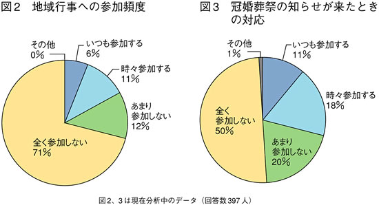 分析中のデータには生活に余裕がないため、地域、親戚・家族づきあいもできず社会生活から孤立していることを示すものも(図2・3)。地域行事に「全く参加しない」が七割、冠婚葬祭の知らせが来ても「全く参加しない」が五割、「ほとんど参加しない」をあわせると七割でした。