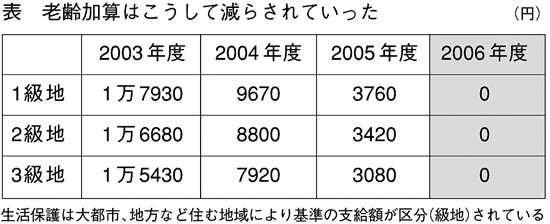 生活保護は、世帯構成などから計算した基準額(最低生活費)に収入が届かない場合、不足分をカバーする形で支給されます。茂木さん夫婦も年金で足 りない分を受給していましたが、老齢加算が廃止された分基準額が下がり、年金との差がなくなりました。月約四万円だった保護費がオムツ代の一万七〇〇〇円 と通院の交通費だけに。ナツエさんの医療費約五〇〇〇円は自己負担になりました。