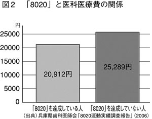 兵庫県の歯科医師会の調査でも、80歳で20本以上歯が残っている人は、20本未満の人と比べて年間の医療費が約2割も少ないと報告されています(図2)。口の健康を保つことは、全身の健康の維持・向上にとっても非常に重要なのです。