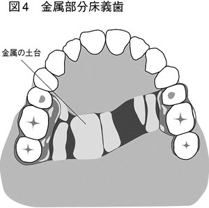 金属部分床義歯 入れ歯の土台部分に金属を使用した入れ歯です。金属を使用するため土台部分の厚みが薄くなって違和感が少なくなり、強度も増すため壊れにくい長所があります(図4)。