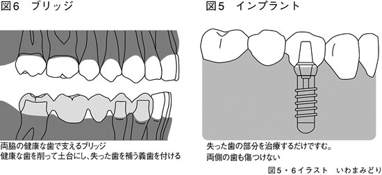 インプラント 失った歯のかわりに人工の土台(チタンなど)を骨の中に埋め込み、その上に冠をかぶせる治療です(図5)。入れ歯の治療に比べ違和感が少なく、噛む力も増します。ブリッジは両側の健康な歯を土台にするために削る必要がありますが(図6)、インプラントは失った歯の部分だけを治療すればすみます。