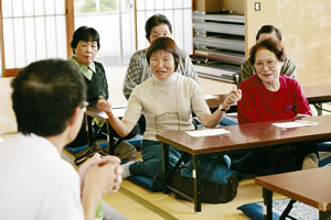 石和共立健康友の会・川中島班の班会にお邪魔しました。公民館に集まったのは一二人、血圧や体脂肪をはかり、秋の健康について石和共立病院の太田昭生医師 が話します。「気候の良い時期は、体力づくりのチャンスです」「筋肉を強くする体操と、筋力をつける体操をやってみましょうか。お風呂でやるのが効果的。 でも、いきまないでね。風呂桶が棺桶になっちゃうからね」