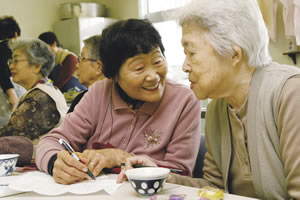 医誠会診療所内で01年から開いた「ほっこりサロン」は、 元祖です。全国高齢者大会の参加者たちがほかの地域の経験に学び、「うちでもやろう」と始めました。食事会や歌、おしゃべり、お正月飾り作りなど楽しく過 ごします。月2回、ボランティア5、6人がお世話役。人気は食事会、そして歌の時間です。「サロンの美人ママ」を自称する門野陽子理事の陽気なリードに笑 いが絶えません。