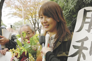 | 勝利判決を受け、支援者にあいさつする内野博子さん(11月30日、名古屋地裁前=撮影・安藤正康) |