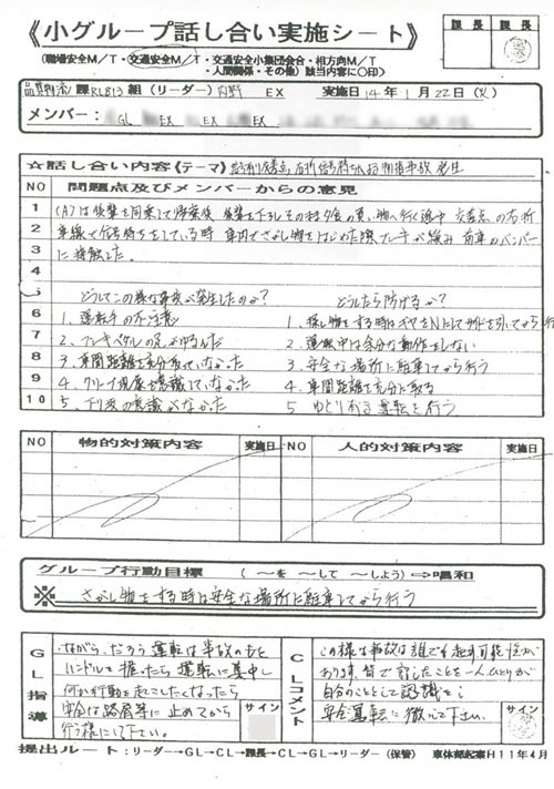 | 小グループ話し合い実施シート。社員の交通事故を避けるため、毎日交通安全運動がおこなわれ、リーダーだった内野さんはグループ内の書類を全部まとめていた。トヨタはこうした業務もすべて「自主活動」と主張した |