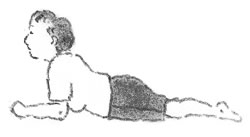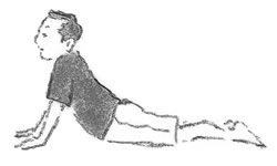 下腹部をつけたまま腕立て伏せのように肘関節を完全に伸ばして上体を支え、ゆっくり息を吐き出しながらオットセイのように十分に背中を反らす。そして、息を吐ききったらうつ伏せになる。これを10回繰り返します。