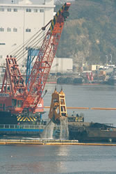 | 大型クレーン船が港内の浚渫作業を続けていた |
