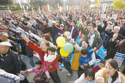 | 座間市「戦争司令部ノー 爆音も原子力空母もゴメンだ!12・2首都圏大集会in座間」には、1万3000人が参加した。横須賀では原子力空母の配備の是非を住民投票で決めよう、と運動が起きている。米軍基地再編強化をストップさせるたたかいは全国で |