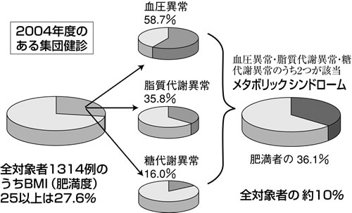 (注)メタボリックシンドローム(代謝異常症候群) へそまわり85cm以上(男)、90cm以上(女)でかつ、(1)脂質異常、(2)高血圧、(3)高血糖のうち2つ以上が当てはまるもの。内臓脂肪がたまって体内代謝に異常が起き、動脈硬化の要因が複数ある状態をいう。
