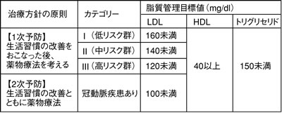 治療の原則は、生活習慣の是正(生活のリズムの正常化、食事療法と運動療法)に加えて、薬剤療法が必要です。脂質の管理目標値は動脈硬化性疾患予防ガイドライン2007(図2、3)に従っておこないます。
