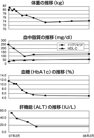 治療では栄養指導で総カロリーを1800キロカロリーに制限、アルコールは半分に。運動は毎日30分歩くこととし、薬物療法もおこないました。