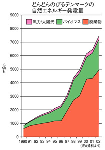 デンマークは人口約540万人ほどの欧州の小国です。国土が平坦で水力発電には適さず、緯度が高いため太陽光も豊かではありません。そんな環境でも風力と バイオマス(生物資源)を中心に推進し、最近10数年間の再生可能エネルギー発電の普及は1990年比で2004年は12倍、平均伸び率は19%強になり ました(図)。