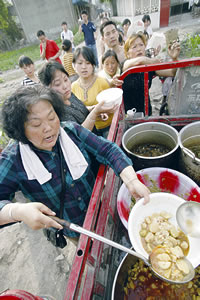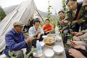 | ボランティアが運び込んだ温かい食事を受け取る被災者たち(通済鎮思文村、5月19日) |