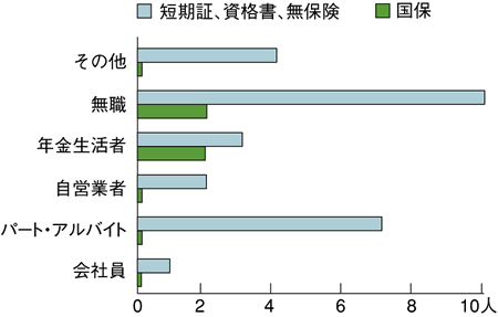 | ↑働いても保険料が払えず、資格書が発行されていたり無保険の人もいた。無職12人のうち、70代以上は3人。生活のため、貯金を使い果たしていた。 |