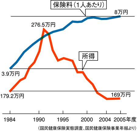 | 図1 国保世帯の所得は下がって保険料は2倍 |