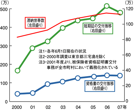 国保料を滞納している世帯は、加入者の約二割にあたる四七四・六万世帯。そして、この滞納者への制裁措置=国保証のとりあげ(別掲)が手遅れ死亡につな がっている。〇七年六月一日現在、短期証は一一五・六万世帯、資格書は三四万世帯に発行されている(図2)。