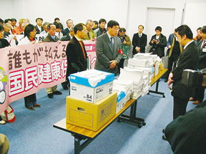 | 署名を提出する京都の人たち。18万2085筆が市政を動かした(写真提供:京都・中右京健康友の会) |