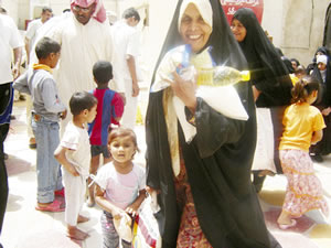 | 食料と水を手にして笑顔をみせる患者家族(バスラ産科小児科病院で) |