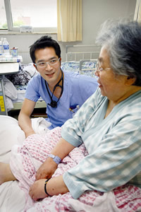 この研修医は身崎伊織さん。現在、道北勤医協の一条通病院(旭川市)で研修中です。訪ねた日は、内科病棟での回診をしており、患者さん一人ひとりに、ていねいに声かけしていました。