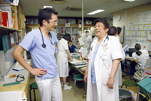 | 一条通病院に支援に来ていた百瀬医師と談笑する身崎医師 |