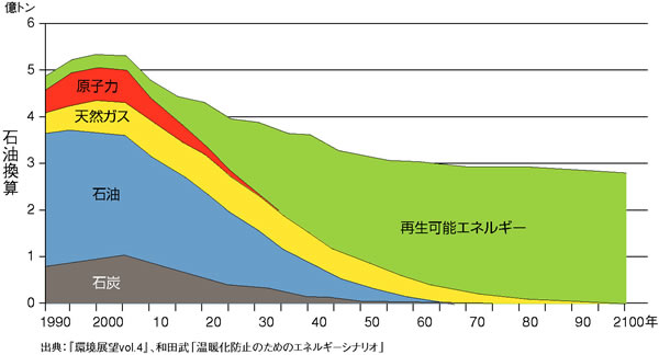 日本は自然エネルギーに恵まれています。図4は筆者が試算したエネルギーシナリオです。いまより生活が不便にならず、脱原発をしながら、2050年までにCO2排出量を90年比で80%削減、2100年にはほぼゼロにすることは可能です。