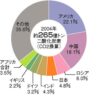 国民1人あたりのCO2排出量…世界で は、2050年までに温暖化ガス排出量を半減する行動計画が検討されている。現在世界人口換算で1人あたり4トンのところを1~2トンにするという目標。 しかし途上国ではいまでも1人あたり1トンという国がある。一方、日本は1人あたり約10トン、アメリカは約20トンといった具合で大きな格差がある。