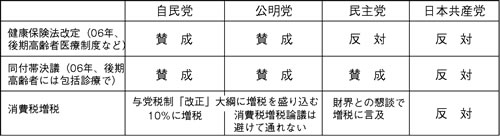 | 後期高齢者医療制度、消費税に対する各政党の態度 |