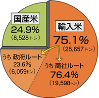 | ■輸入事故米のうち商社ルートは76.4%を占める。 商社ルートとは、輸入時に食品衛生法違反とわかり、商社が業者に流した事故米。政府ルートとは、保管時に発生した事故米で政府から業者に流れたもの |