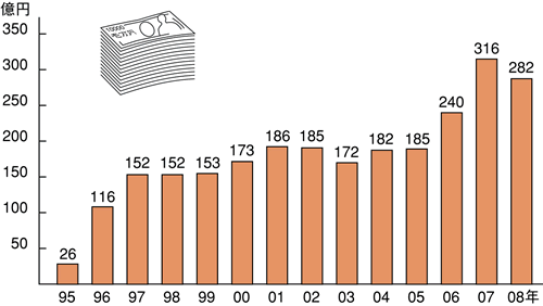 | ■1995~2006年度は実績、2007年度は見込み、2008年度は予定 ■管理経費とは、MA米にかかわる運賃、保管料、事務費など |