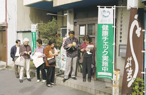 定期的に健診を受けているという楠田和子さんは「ここの出張健診を初めて受けたとき、初期の胃がんが見つかったんですわ。すぐ病院を紹介してもらったの で、大事には至らず治療できました。それまで自覚症状はなかったのでびっくりでした。あのときここに来ていなかったら、重症になっていたかも…」と、信頼 を寄せます。近所で受けやすいというのが好評で、次から次へと…口コミで広がっているようです。