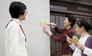 友の会役員の佐藤由紀子さんも自宅前に張りました。すると数日後、診療所とは縁のなかった近所の奥さんがやってきて、おそるおそる「ワッペン見てきたん やけど、主人が血尿で…」と。佐藤さんがすぐに診療所に電話をすると、その間も拝むように手を合わせています。