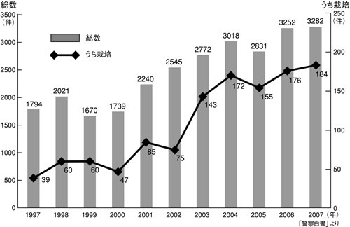 無許可所持の最高懲役は5年、営利目的栽培では最高懲役10年です。2007年の大麻取締法違反での摘発件数は3282件。そのうち栽培で摘発された件数は184件で、10年前の約4倍です(グラフ1)。昨今はインターネットで「鑑賞目的」と称した種の販売がおこなわれており、2008年はさらに増えていると予想されます。