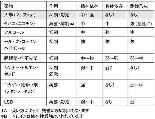 大麻の依存性は他の薬物と比較して、特別強いものではありません(表)。以前は大麻には身体依存はないといわれていましたが、今は存在する可能性が指摘されています。