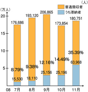 「この間の経過を見ただけでも、だんだんと滞納率が悪化してきているのがわかります。年金支給 のない奇数月ごとに一気に悪化していきます。とくに一一月は府内の滞納率が四〇%近くにあがっています。このままいくと年度末にかけて滞納は、もっと増え るでしょう」と、大阪社保協事務局長の寺内順子さん。
