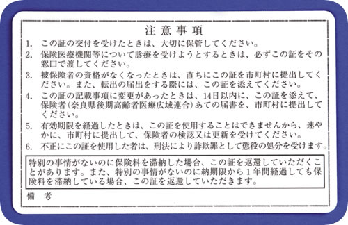 後期高齢者医療保険証の裏には「1年滞納者からは返還させる」と明記されている |