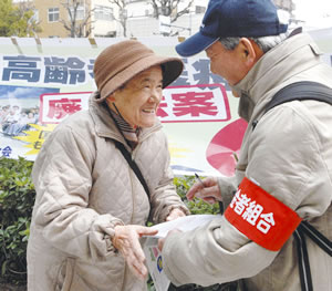 「四天王寺(大阪市)で、大阪高齢運動連絡会や介護保険料に怒る一揆の会と一緒に毎月定例でおこなっている署名・宣伝行動での反応はスゴイ。ビラの受け 取りも毎回よくなっています。署名をして、『どうしても廃止してほしいんや』と、拝んでいくお婆さんもいた。『ゼッタイあきらめへんから、がんばろな…』 という高齢者の強い思いを感じます」と寺内さん。