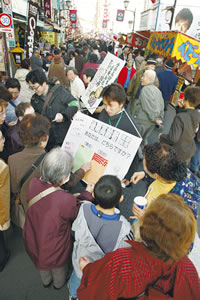 「後期高齢者医療制度」についてどう思うか、「賛成・反対」のシール投票をよびかけました。この日は、前日に六回目の年金天引きがあったばかり。アンケートを呼びかけると数分で人だかりが…。
