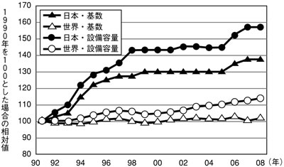 そもそも日本は、世界でも異常なほど原発重視の国。原子炉55基、総設備容量4958万W、ア メリカ、フランスについで世界3位です。世界全体の原発数は90年426基から06年429基と微増ですが、この期間、日本は15基増やしています(建設 中3基、計画中11基でフランスと肩を並べるのも時間の問題)。設備容量も突出して伸びています(図)。