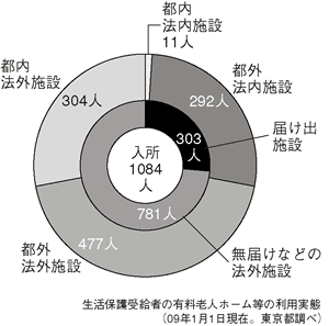 都民が群馬県の施設にいたこと、これは珍しい話ではありませんでした。都の最近の調査によると、都外の有料老人ホームに入居している都民は七六九人にのぼっています。このうち、たまゆらのような「無届け施設」にいる人は四七七人(図1)。
