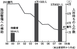それどころか、都は増設を抑制。三八六人を受け入れていた三カ所の都立老人ホームを廃止、特養ホーム運営補助費の打ち切り(二〇〇〇年)、さらにこの三月には、特養ホームの建設用地を購入する区市町村や社会福祉法人に出していた用地費助成制度まで廃止しました。