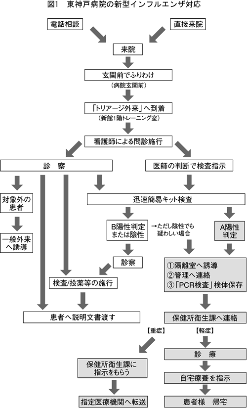 その後も東神戸病院は、「新型インフルエンザ対応委員会」を適宜開き、新型インフルエンザの情報の収集と職員への周知、診察の手順・感染防御の基準の作成(診療の手順=図1)、必要物資(検査用品、治療薬、マスクなど)の確認、職員の健康状態の把握と勤務体制の検討などをおこないました。