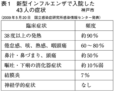 今回の新型インフルエンザは、通常の季節性インフルエンザとそれほど違ってはいません。発熱、全身倦怠感(だるさ)、咳、咽頭痛、鼻汁・鼻づまりなどが 多くみられます。外国では下痢・嘔吐などの消化器症状が多かったといわれていますが、神戸市で入院した患者さんの分析では、10%程度でした(表1)。