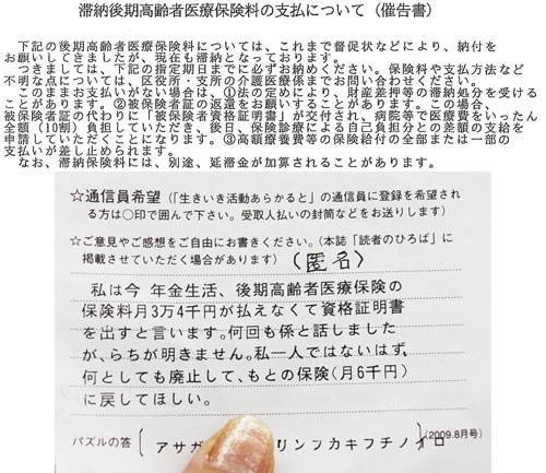 後期高齢者保険料の支払いができずにいた人に、催告書が送られていました。 「未納のままだと、医療費一〇割負担になる資格書の交付もある」という内容。また、読者からもハガキが(写真)。“滞納者の相談に乗り、資格証明書の発行 はしゃくし定規にしないように”と、厚労省も求めているはずなのに…心配です。