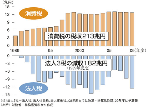 では、消費税はどこへ消えたのか? 消費税導入後の二一年間で国庫に入った消費税は二一三兆円。一方で導入前と比べて減った法人三税は一八二兆円。実に消費税の税収の八~九割が、法人三税の減税にあてられた計算です(図1)。