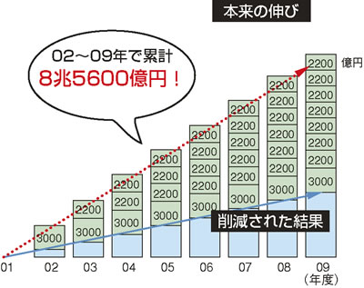 一方、社会保障予算はどうか。高齢化にともない年金や医療費は増えていきます。その自然増分を小泉内閣誕生後、毎年二二〇〇億円(〇二年度は三〇〇〇億円)も削っています(図2)。削減総額は累計八兆五六〇〇億円(〇二年度~〇九年度)。これでは社会保障がよくなるはずがありません。